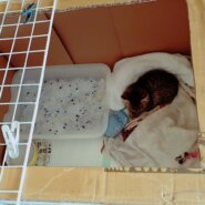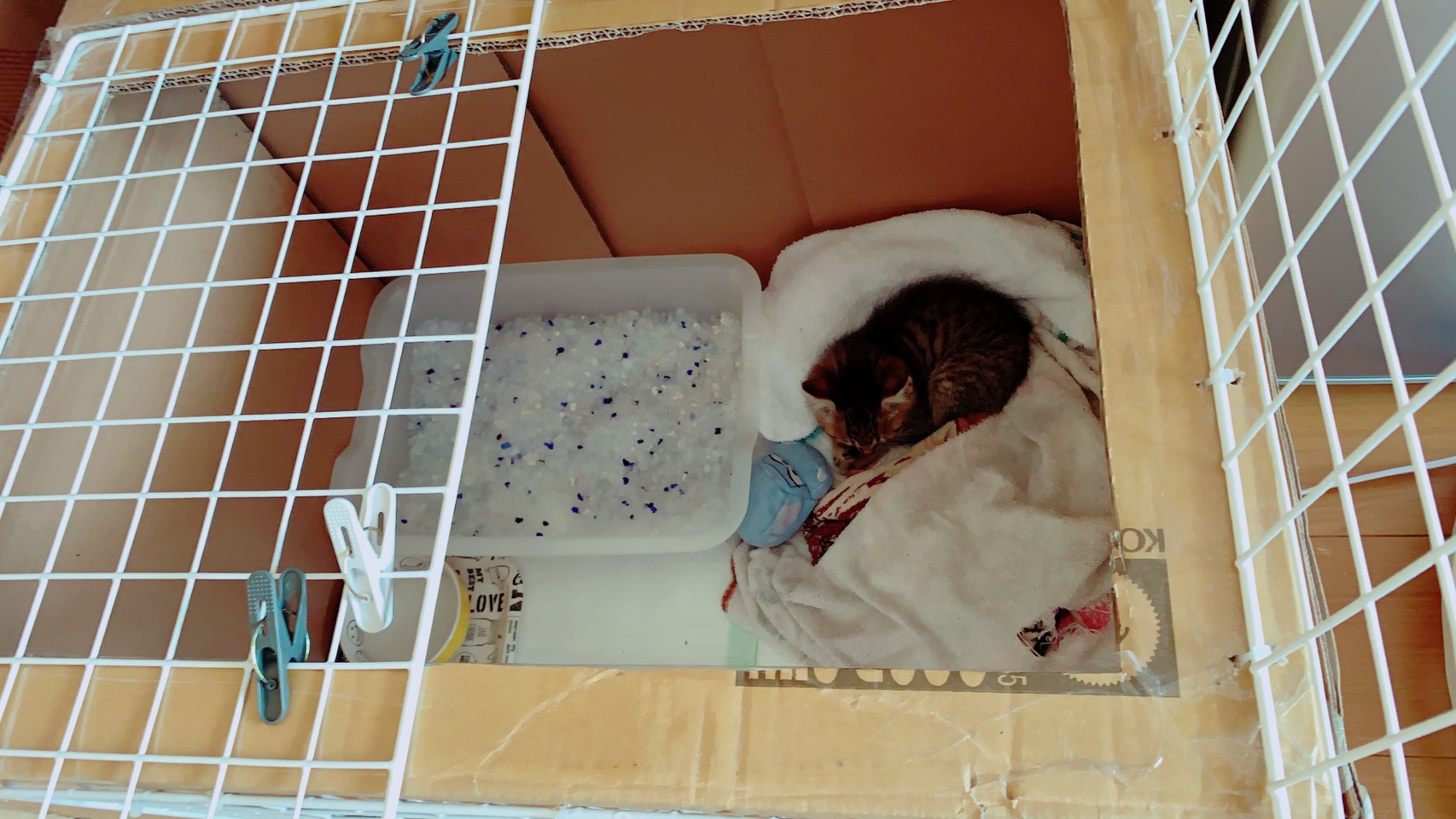 画像の子猫は1枚目は連れてきた日、2or3枚目は3日目、4or5枚目は簡易ダンボールゲージ外観と中身を載せてます。