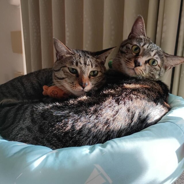 キジトラ(灰色っぽい・スイカの首輪)猫らしく、ツンとした性格。反面、ご飯のときは喉をならして近寄ってきます。よく食べます。少し警戒心が強いですが、慣れたら近寄ってきます。