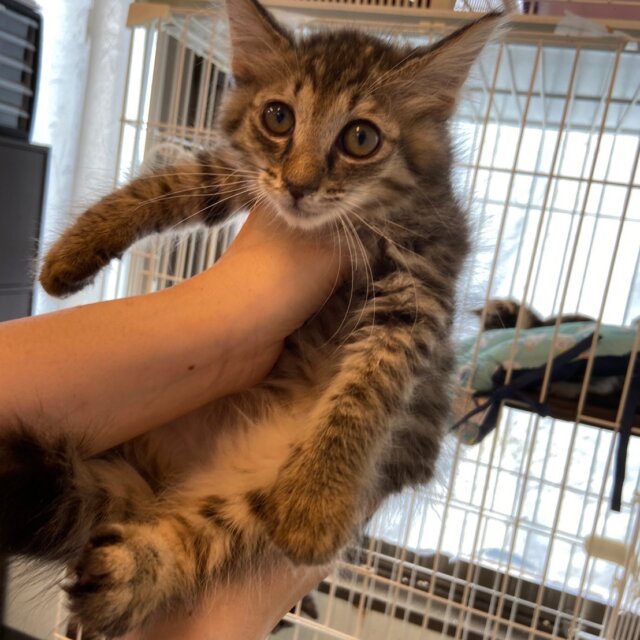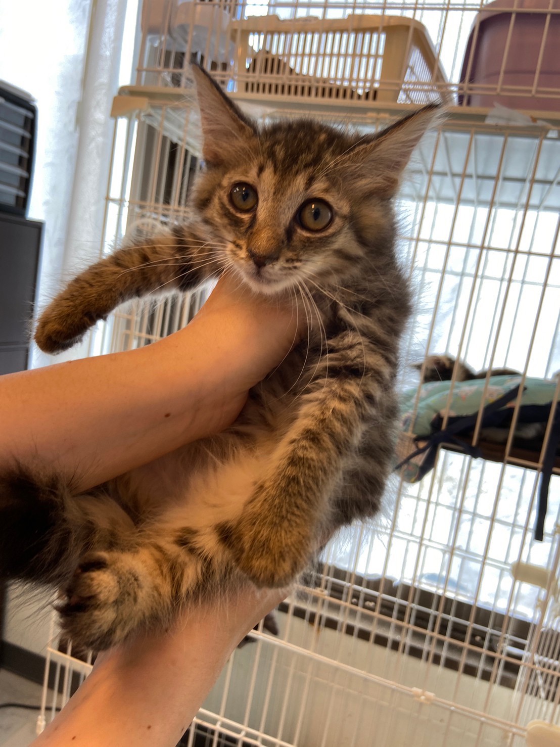 ゆうくんは現在子猫部屋ケージで過ごしておりますが、隙あらば脱走しようとするわんぱくな子です。でもごはんの時は他の子におしのけられてしまったり気弱な一面も。触ることも抱っこもできます。もふもふ長毛で可愛いです!