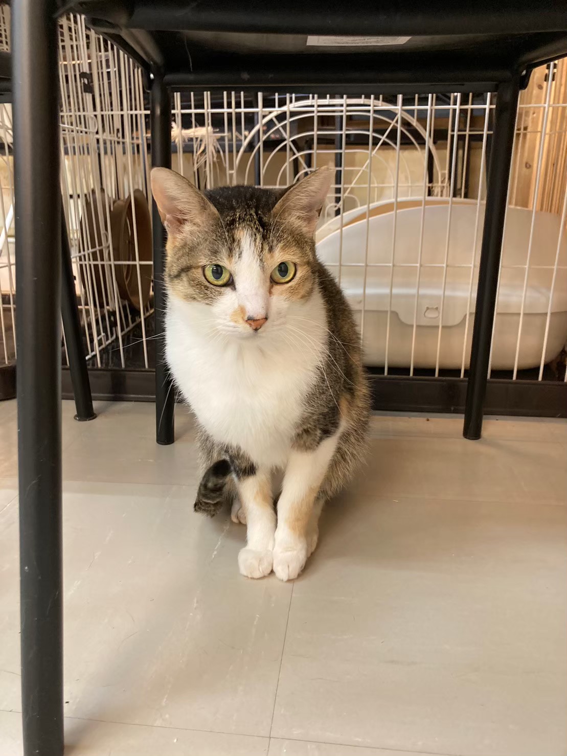 保護当初から怖がりさんでシャーシャーすることが多いですが、お腹がすくと「にゃー」と鳴いてアピールするにゃんこです。近づくと逃げてしまったり、人が怖いのか引っ掻いてしまい、ご飯食べている時だけふれあいOKだったのですが、最近は人間の近くで過ごすことが多くなり、タイミングによってはなでなでさせてくれるようにもなった、人慣れ度上昇中の猫ちゃんです。