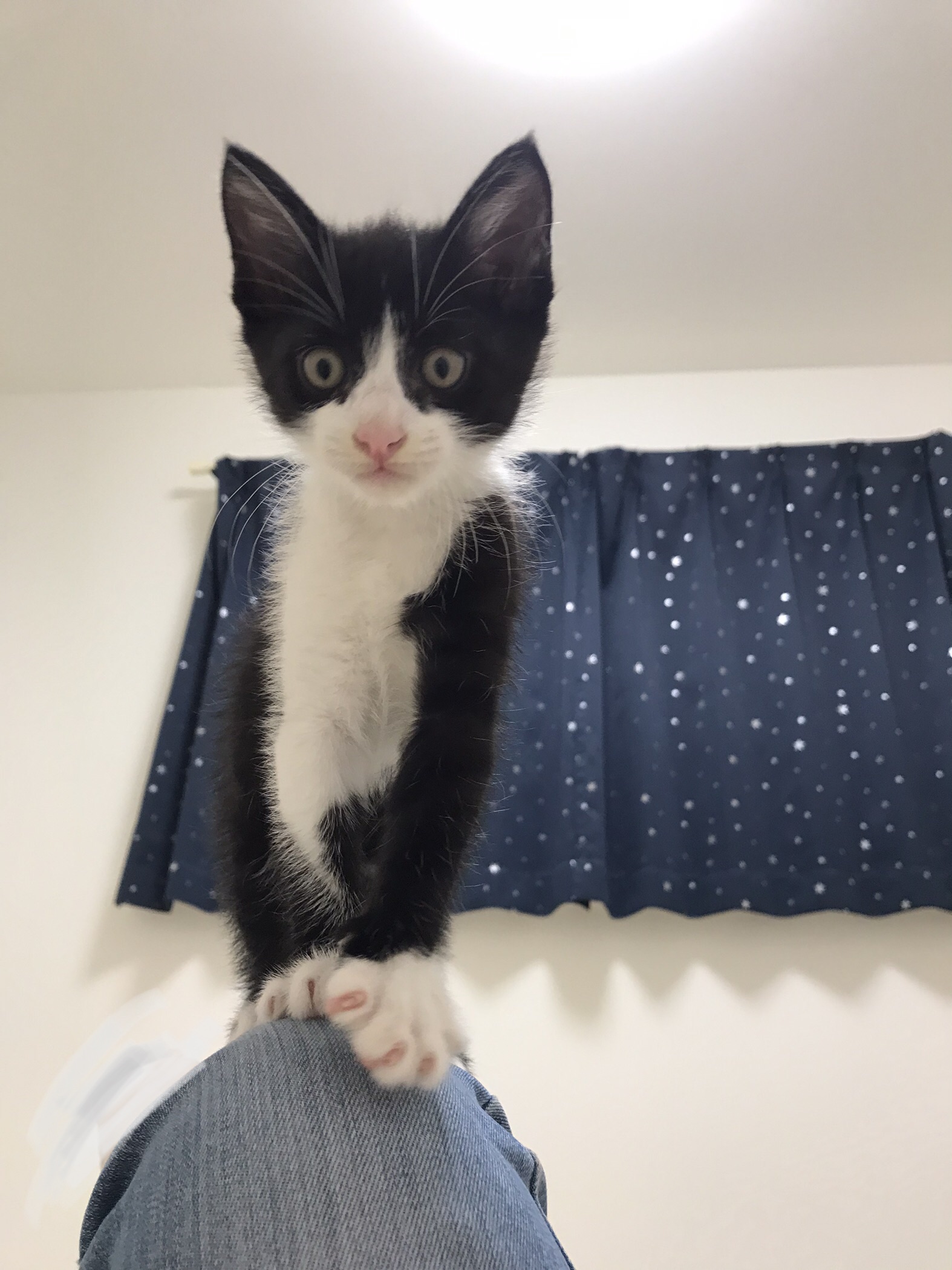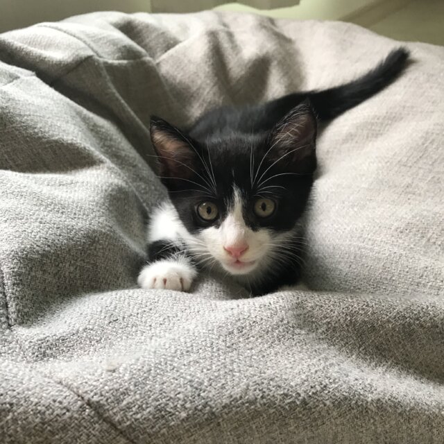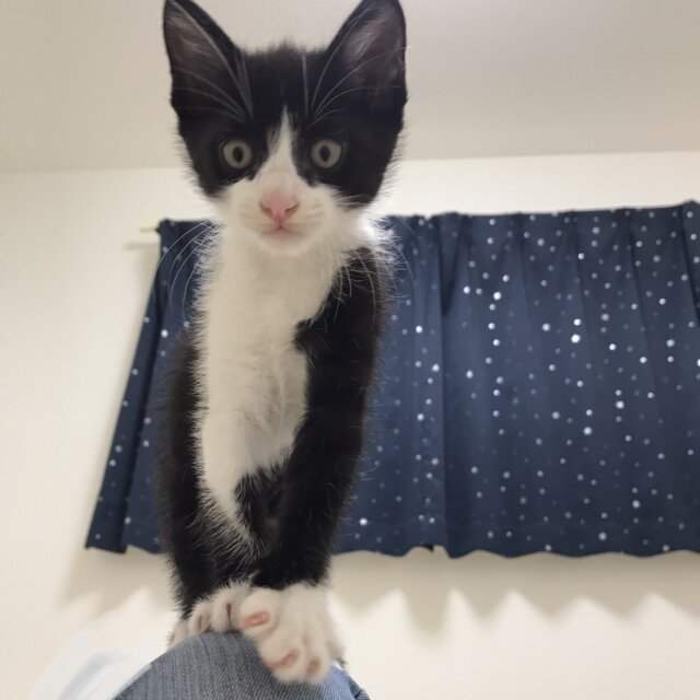 黒多めの白黒ハチワレの男の子。