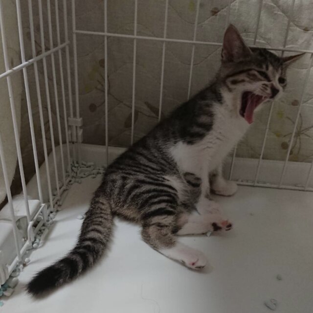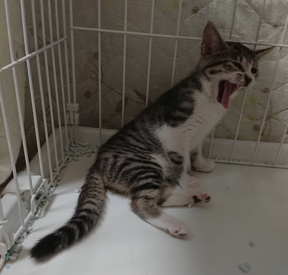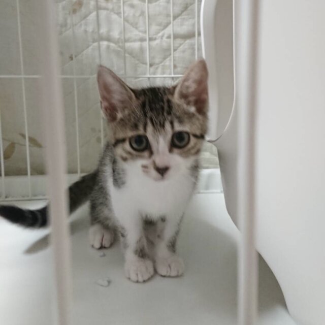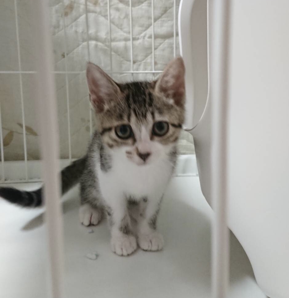 とても美しい子猫です。「ちゅ〜る」が大好き、見ただけで喉をゴロゴロ鳴らします。今のところ、抱っこはどちらかというと苦手です。一緒に育てられている王ちゃんと仲良しで、王ちゃんの後ろに隠れて様子を見ています。ケージの扉を開けるとすぐに脱走するキュートな姫ちゃんです。