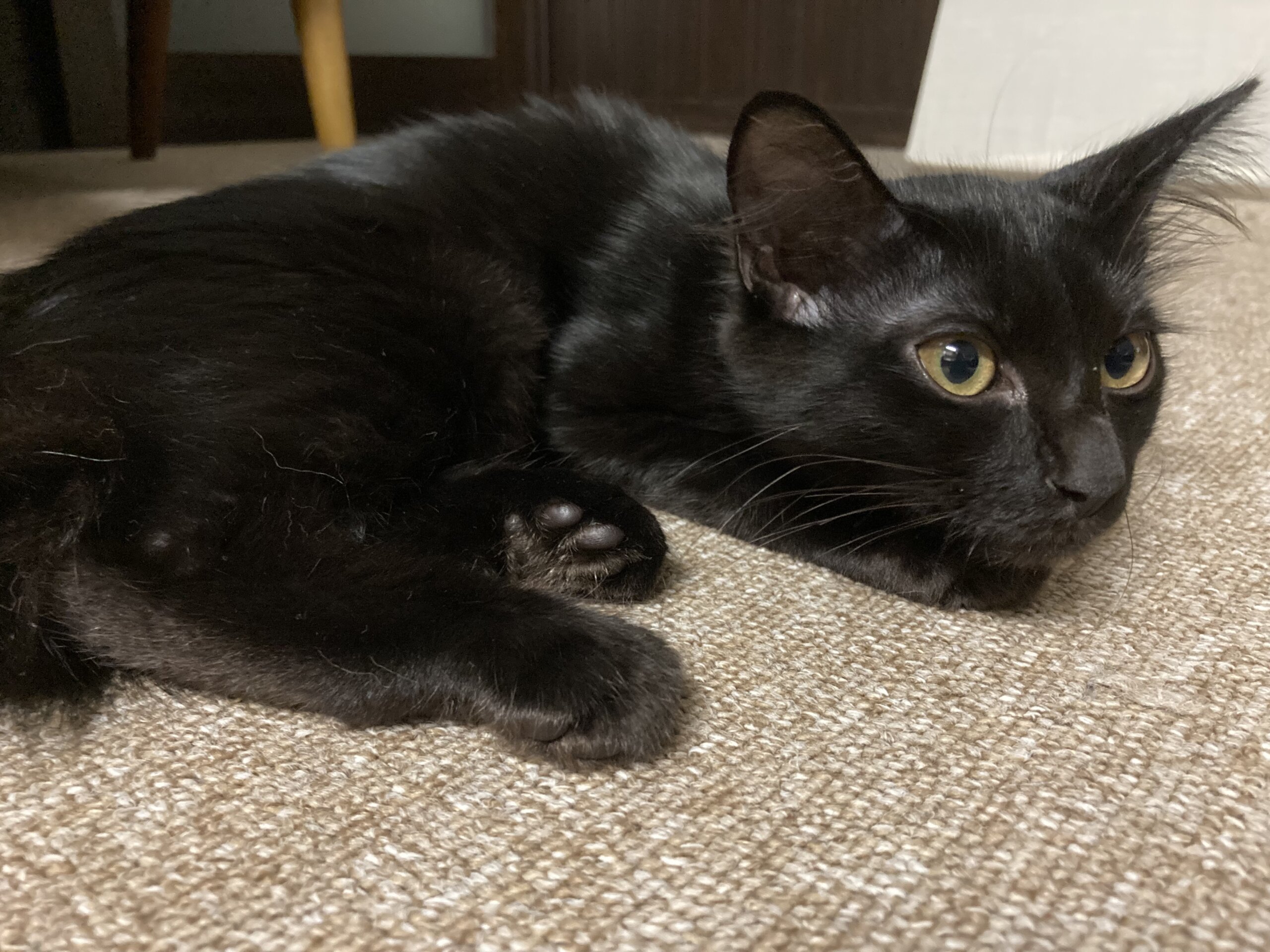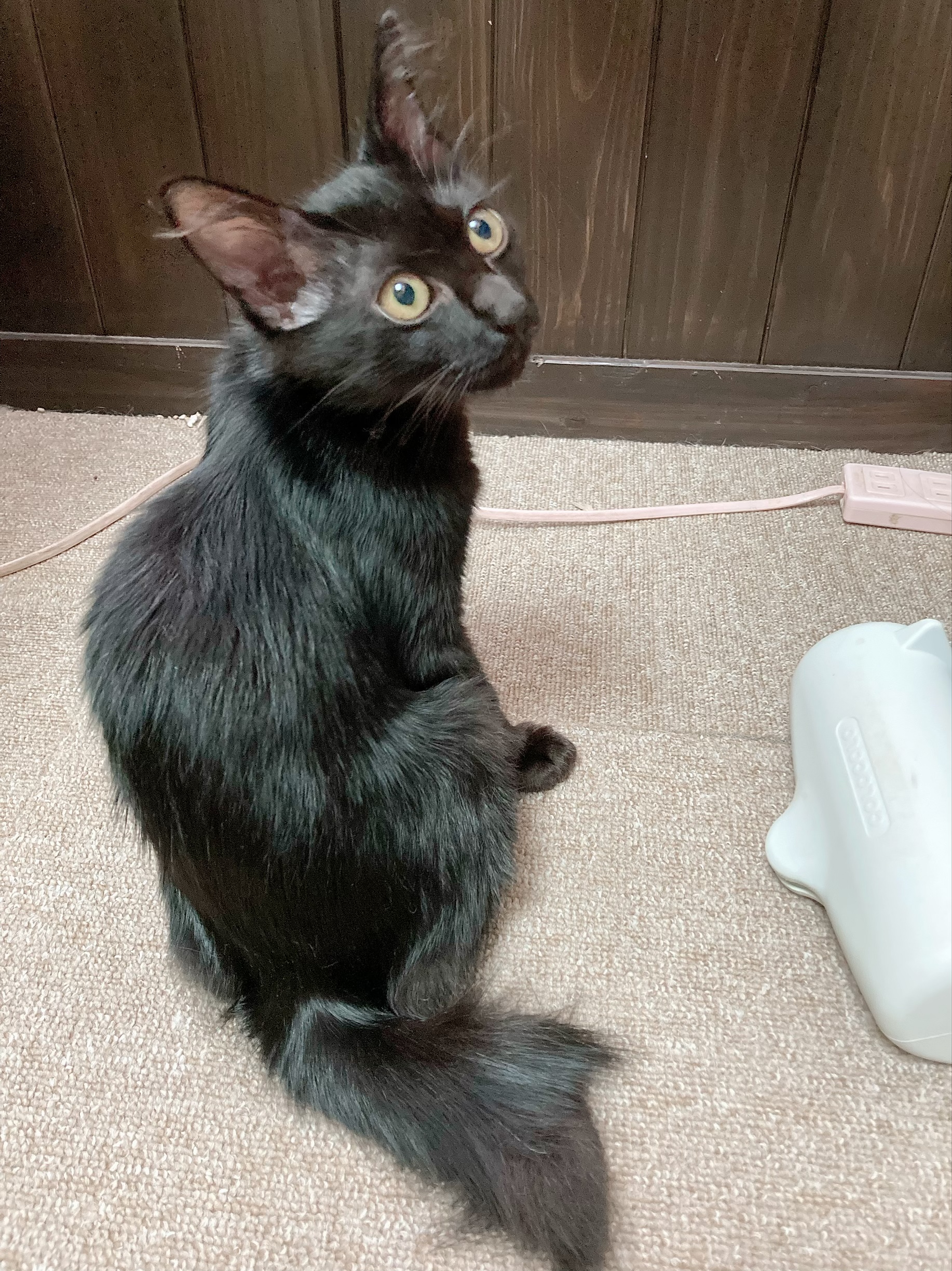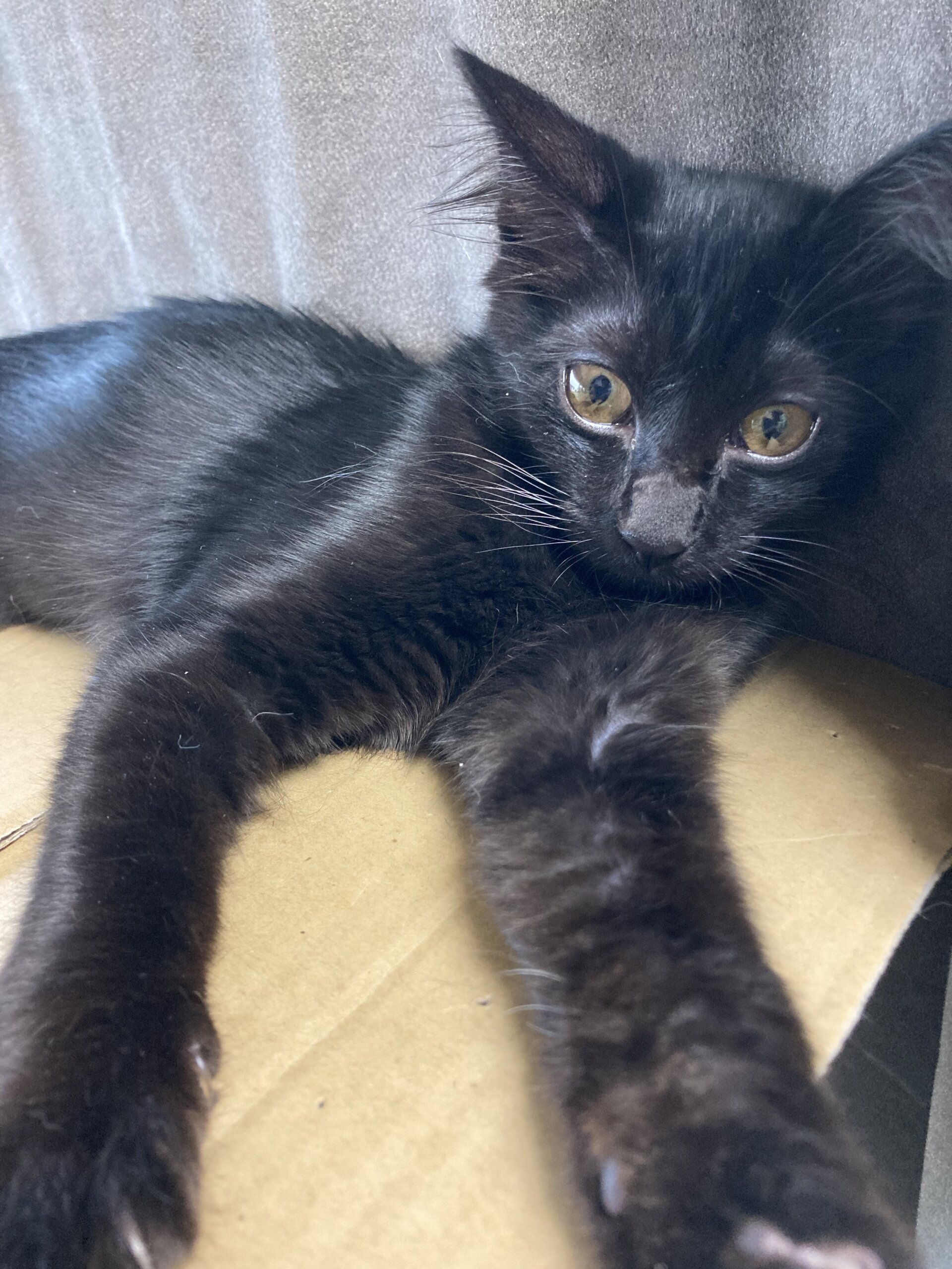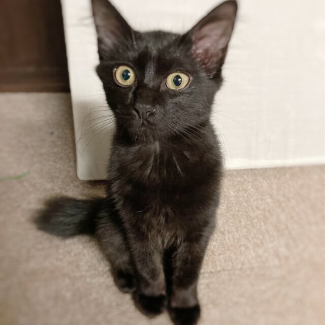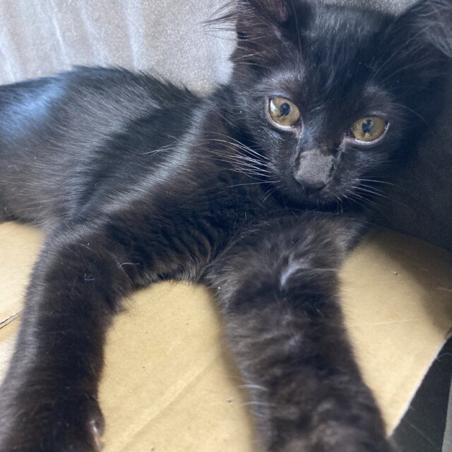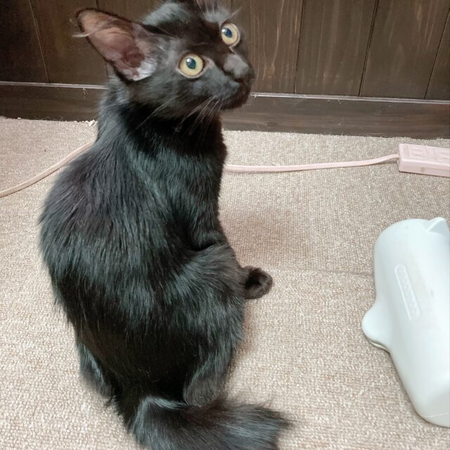 黒の中毛、長しっぽの女の子です。フサフサでつやつやした毛触りです。少しビビリちゃんですが、慎重派なだけ。