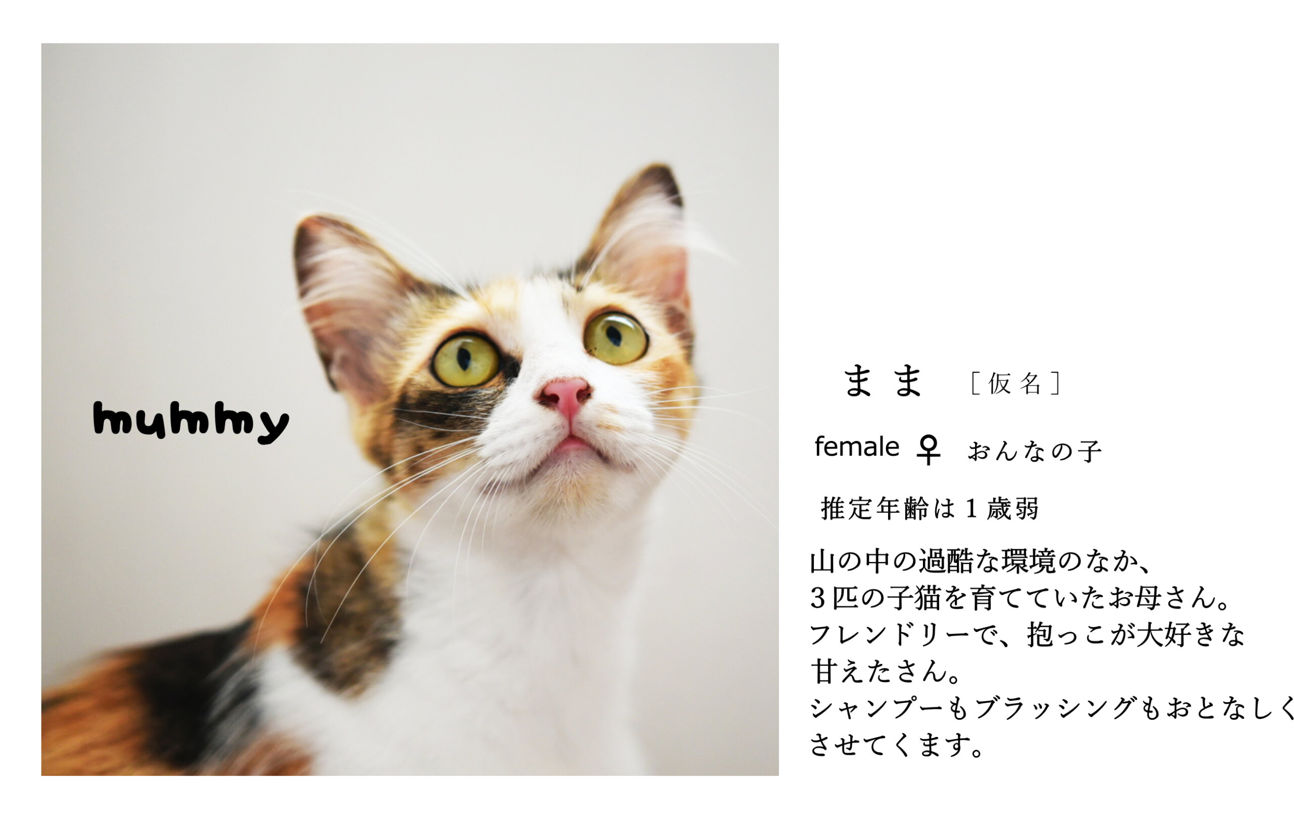 | 年齢/月齢 | 成猫 推定1歳前後 |