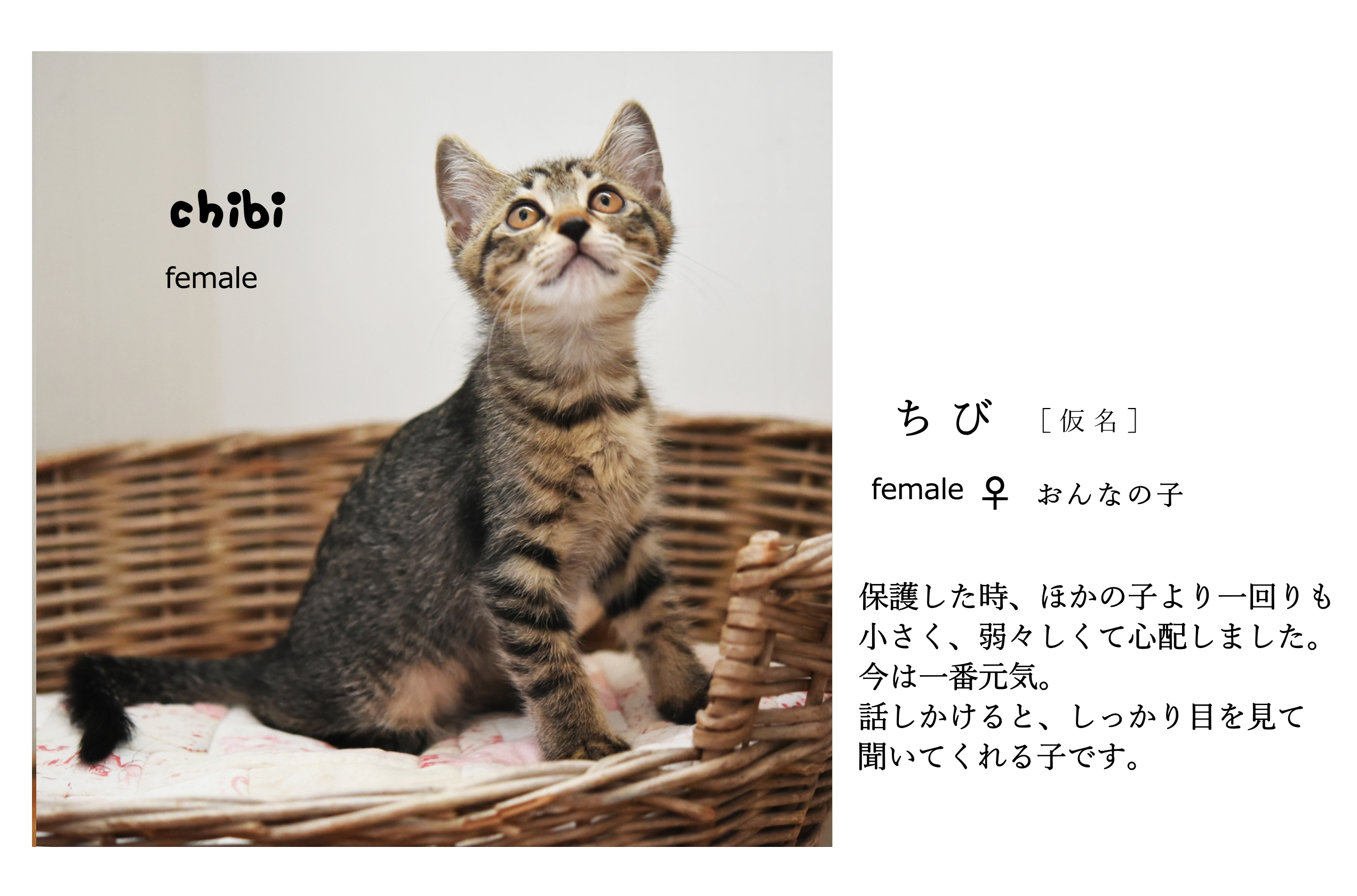 本来でしたら私のほうで家族に迎えたいところですが、重篤な状態で先の見えぬ入院をしている家族と老犬がおります、そして何より私自身が猫アレルギーを発症してしまい、かなり症状が重く投薬の状態の為、断念致しました。