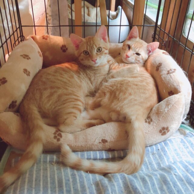どちらも元気ですが、目がしっかり開いていない方の子が保護した時に猫風邪が酷く、目が開いていない状態で、ここまで開くようになりましたが、眼瞼内反症(逆まつげ酷い版)と診断されました。見えていて支障はないですが毎日目薬滴下しています。どちらもウイルス検査(エイズ・白血病)陰性