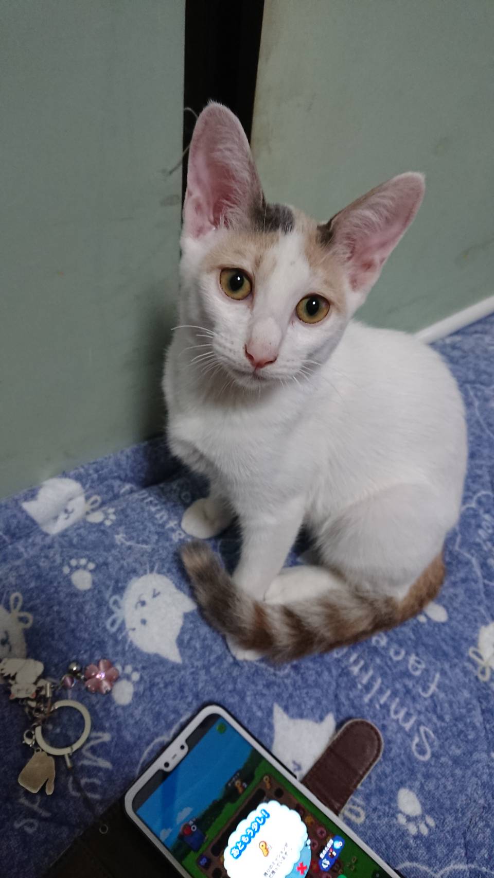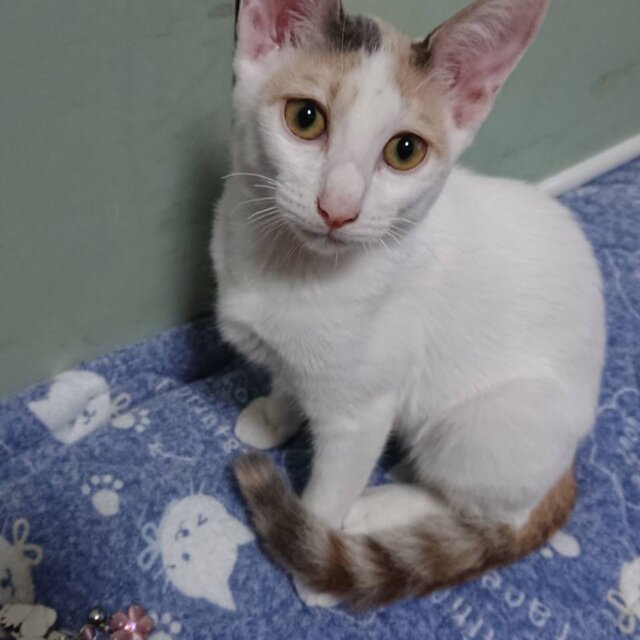 三毛猫女の子ですが柄模様が変わっていて人見知りもしないし膝の上が好きです。おてんばさんで元気が良いです。尻尾が長くて甘えん坊さんです。寝る時はお腹とか背中の上で寝ます。
