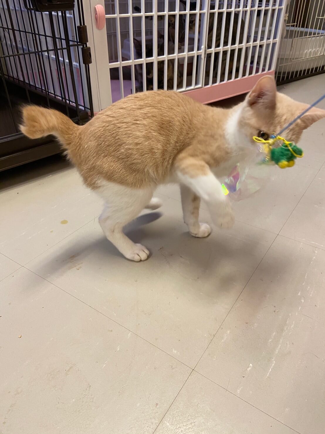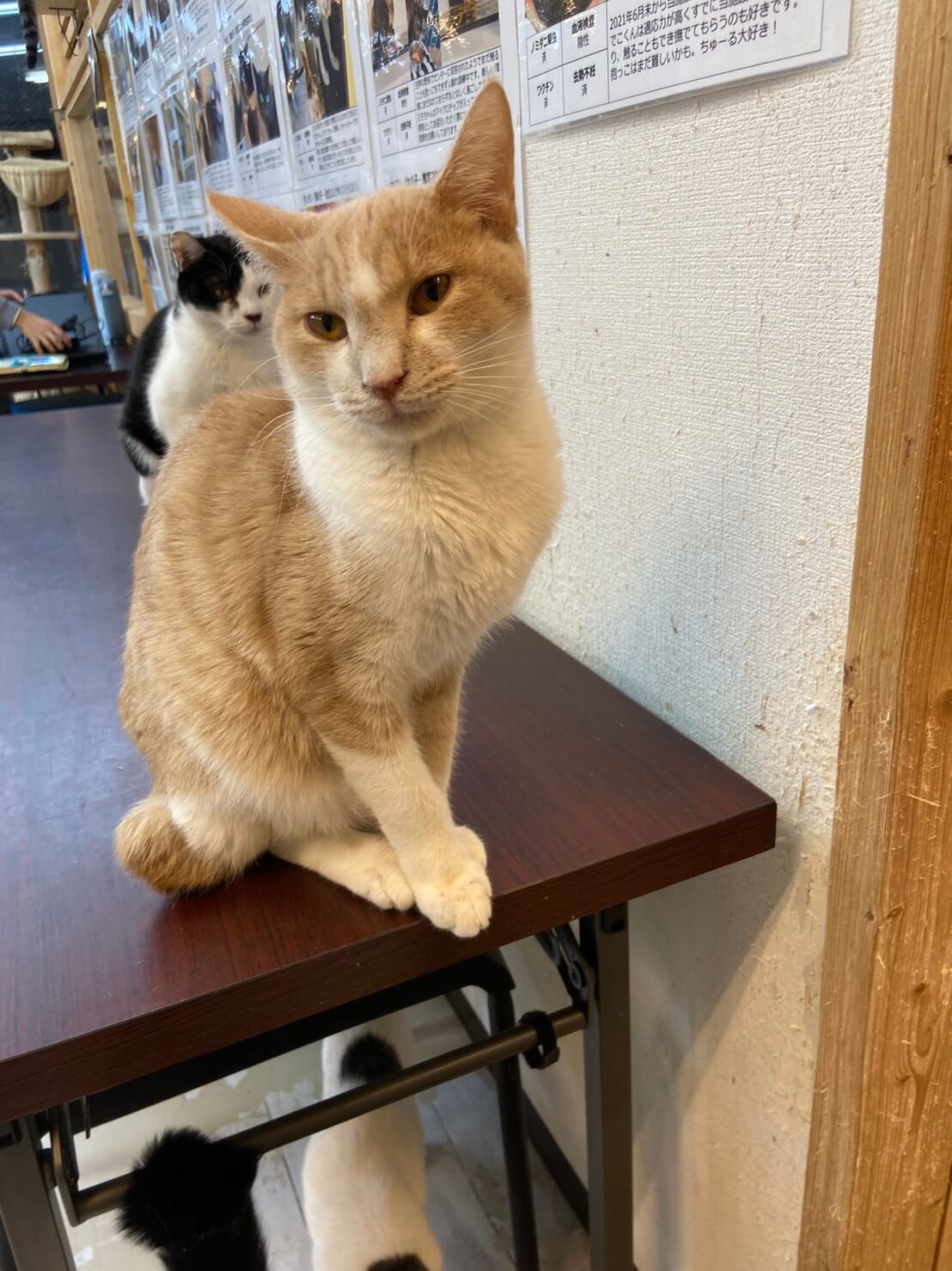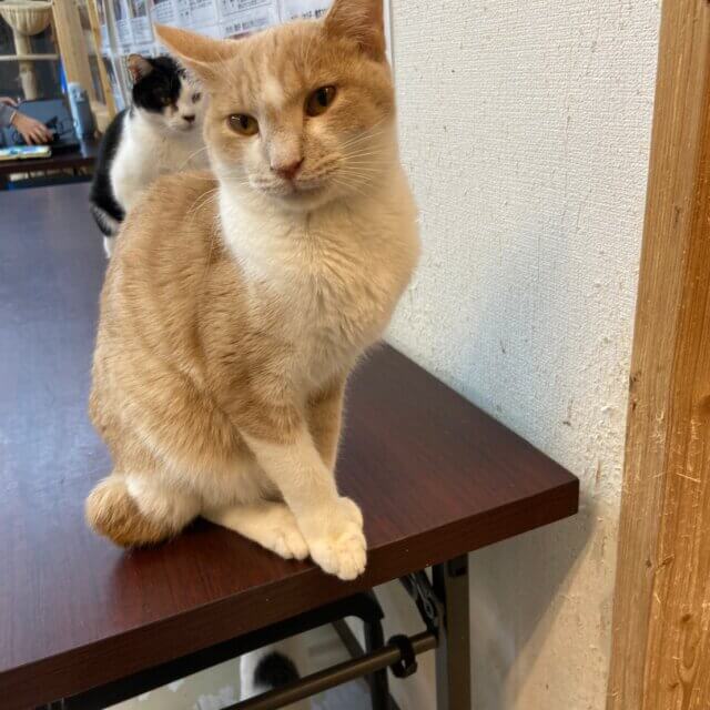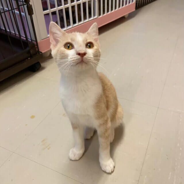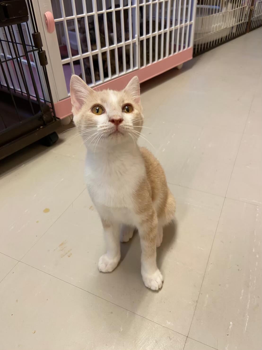 茶白パステルカラーのでんくんは2021年8月末に当施設に仲間入りし、きた当初から野良だったとは思えないくらい触れるし抱っこもできるいい子です。主にお腹すいた時に鳴いてアピールします!とっても可愛いです♪