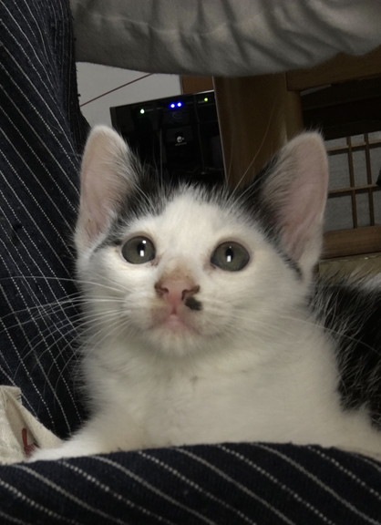 お顔にちょびひげのある可愛い仔です。人が座っていると、ふいに膝に乗ってきてそのまま眠ったりします。
