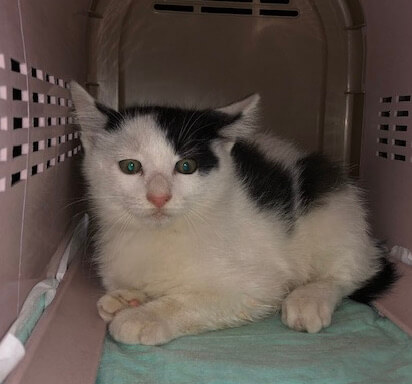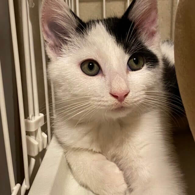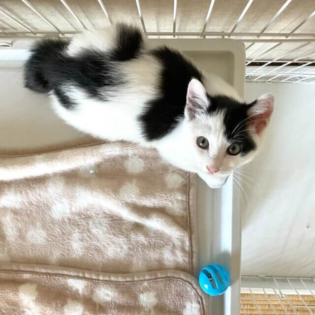 白黒子猫で、短い尻尾がとてもキュートです。