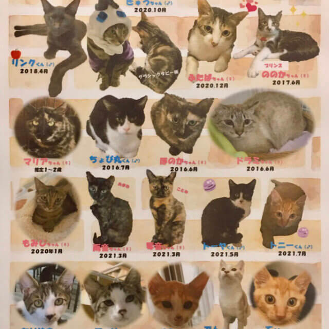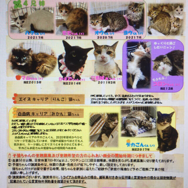愛護センターからの引き受け、多頭飼育崩壊が多く、眼が突出してしまった子や身内がいなくなりひとり取り残されてしまった子など様々な理由から保護した子達です。
