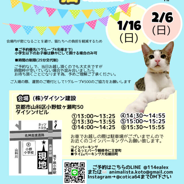 会場内が密になる事を避け、猫さん達の負担を軽減するため、ご予約優先とさせて頂いております。
