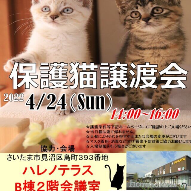 【さいたま市】4/24(日)ハレノテラス保護猫譲渡会
