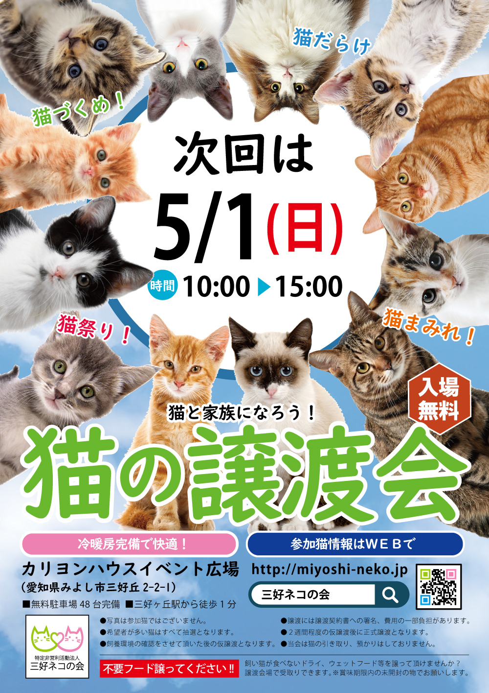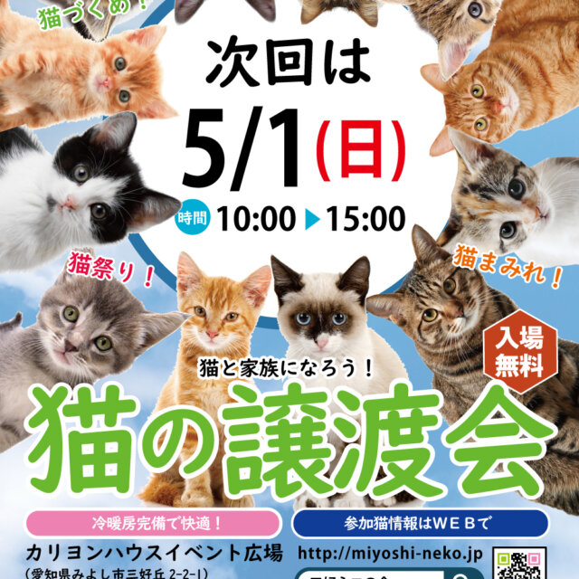 5月1日(日)は10匹ねこねこ譲渡会です。