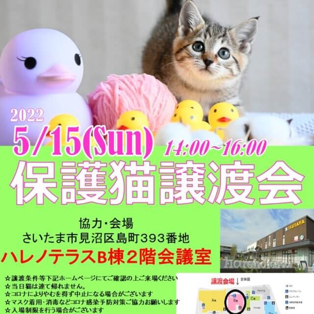【さいたま市】5/15(日)ハレノテラス保護猫譲渡会
