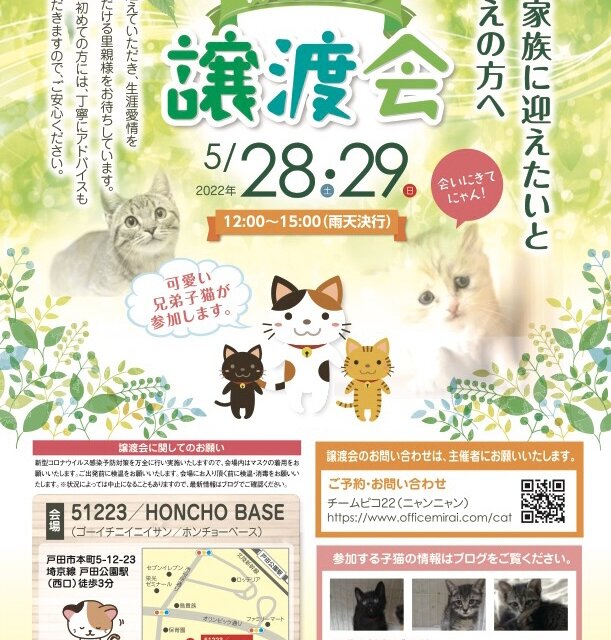 主に八潮市で保護された猫たちの里親になってくれる方を募集してます。