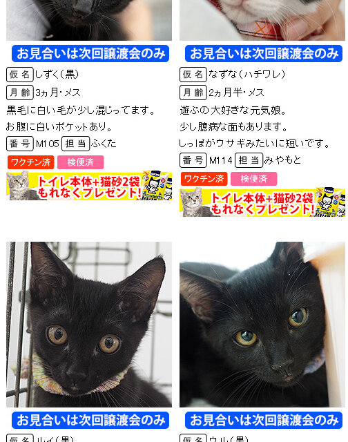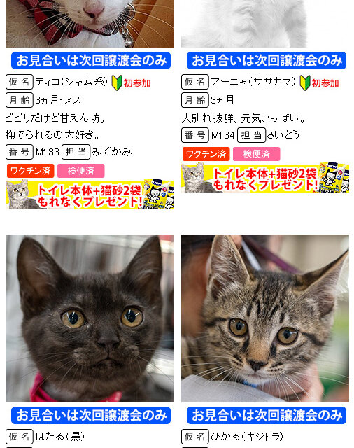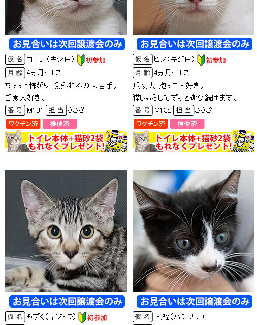 保護主様によって譲渡基準、手数料、ワクチン代、治療費が異なります。