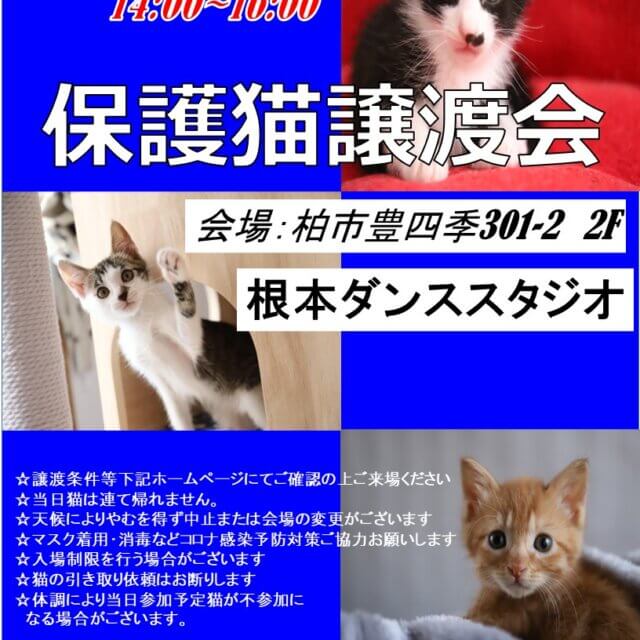 【こねこがいっぱい】8/21(日)根本ダンススタジオ保護猫譲渡会