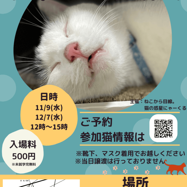 大阪京橋の駅から徒歩6分の猫カフェでねこの譲渡会を毎月のんびり開いています。