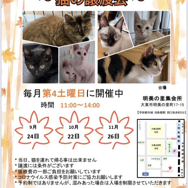毎月第4土曜日に四条畷駅 猫の譲渡会を開催させていただいています