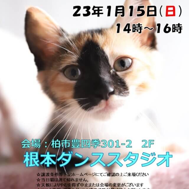 【柏市】1/15(日)根本ダンススタジオ保護猫譲渡会