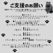 猫砂(木かおからの流せるタイプ)、フード、ウェットフード、TNRで使用するペットシート、新聞紙、バスタオルなど嬉しいです♪