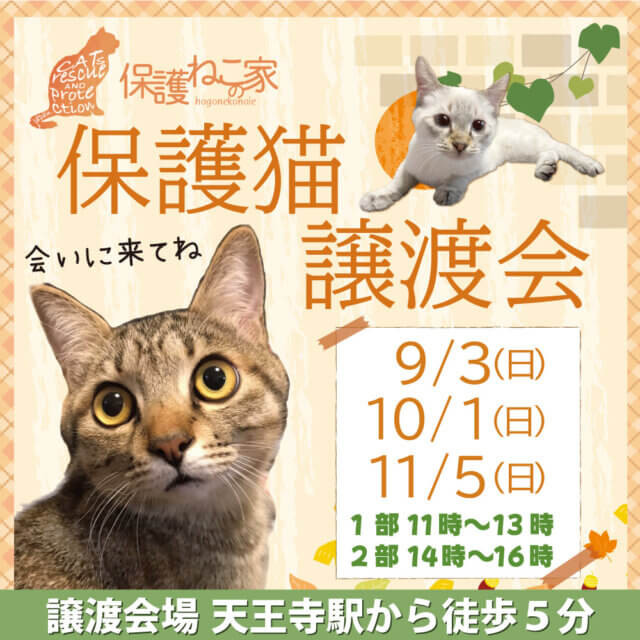 毎月第1日曜の11時~13時と14時~16時の2部制にて「保護ねこの家 譲渡会」を開催しています。