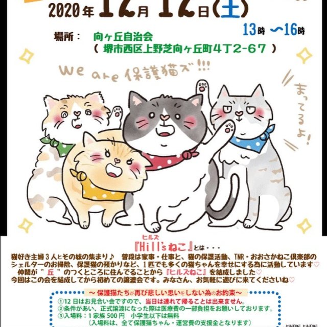 猫の譲渡会 堺上野芝 募集番号:3743 掲載日:2020/11/22 開催日 2020.12.12 (土) 時間 13時~16時 場所 堺市西区上野芝向ケ丘町 4丁2-67 会場名 向ヶ丘自治会館 内容 初めての開催です。 駐車場完備。 JR上野芝駅より徒歩10分です。 良い出会いをお待ちしています。 ☆ 入場料 1家族さま¥500 開催日: 2020.12.12 (土) 時間: 13時~16時 場所: 堺市西区上野芝向ケ丘町 4丁2-67 会場名: 向ヶ丘自治会館 画像2枚目: 画像3枚目: 画像4枚目: 画像5枚目: スポンサーリンク この譲渡会情報をSNSで広めよう! Twitterでシェア Facebookでシェア はてなブックマーク LINEで教える 投稿者: Warning: Undefined variable $userID in /home/petwa/pochi-tama.net/public_html/wp-content/themes/pet/single-joutokai.php on line 150 おおさかねこ倶楽部 この投稿者の情報を見る