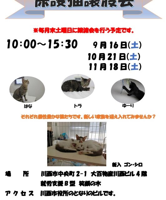 9月16日(土)に保護猫譲渡会を開催致します。子猫ちゃん2匹が加わり5匹の猫ちゃんがお待ちしてます。是非お越し下さいませ。