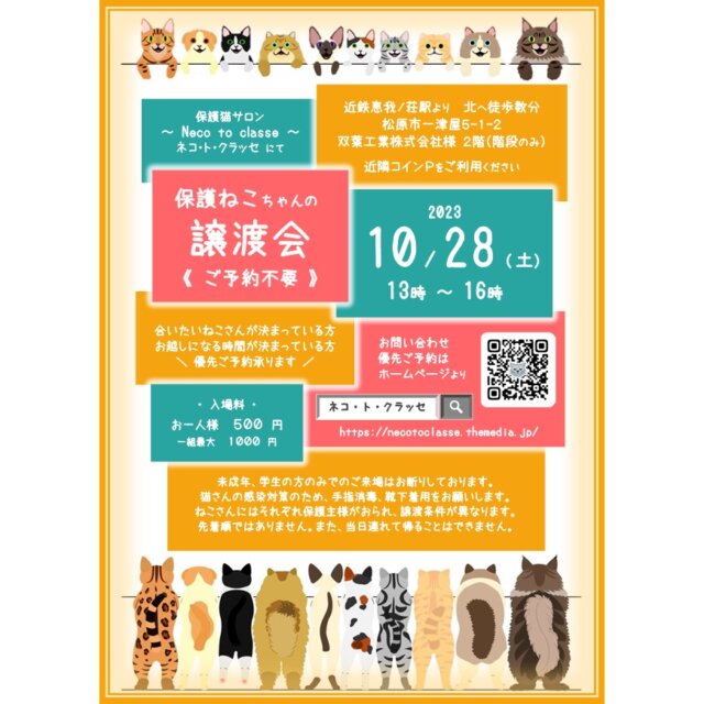 毎月第1日曜の11時~13時と14時~16時の2部制にて「保護ねこの家 譲渡会」を開催しています。