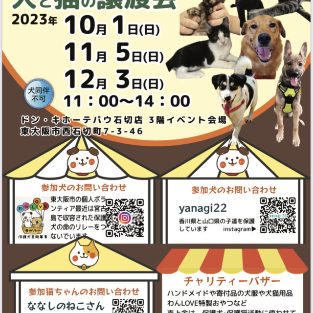 わんちゃんねこちゃん合同譲渡会 募集番号:39600 掲載日:2023/09/22 開催日 10月1日 時間 11時から14時 場所 東大阪市西石切町7-3-46 会場名 ドン・キホーテパウ石切店 3階イベント会場 内容 毎月第1日曜日にドン・キホーテパウ石切店 3階イベント会場にてわんちゃんねこちゃん合同譲渡会を開催させていただきます チャリティーバザーもございます みなさん可愛いわんちゃんねこちゃんに会いにいらしてくださいね 開催日: 10月1日 時間: 11時から14時 場所: 東大阪市西石切町7-3-46 会場名: ドン・キホーテパウ石切店 3階イベント会場 画像2枚目: 画像3枚目: 画像4枚目: 画像5枚目: スポンサーリンク この譲渡会情報をSNSで広めよう! Twitterでシェア Facebookでシェア はてなブックマーク LINEで教える 投稿者: Warning: Undefined variable $userID in /home/petwa/pochi-tama.net/public_html/wp-content/themes/pet/single-joutokai.php on line 150 ななしのねこさん この投稿者の情報を見る