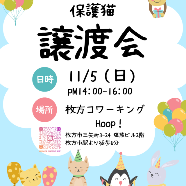 保護猫譲渡会 募集番号:41414 掲載日:2023/10/23 開催日 2023/11/5 時間 14:00〜16:00 場所 枚方市三矢町3-24 塩熊ビル2階 会場名 枚方市コワーキングHoop! 内容 はじめて開催の保護猫譲渡会です。 開催日: 2023/11/5 時間: 14:00〜16:00 場所: 枚方市三矢町3-24 塩熊ビル2階 会場名: 枚方市コワーキングHoop! スポンサーリンク この譲渡会情報をSNSで広めよう! Twitterでシェア Facebookでシェア はてなブックマーク LINEで教える 投稿者: Warning: Undefined variable $userID in /home/petwa/pochi-tama.net/public_html/wp-content/themes/pet/single-joutokai.php on line 150 てんきな この投稿者の情報を見る