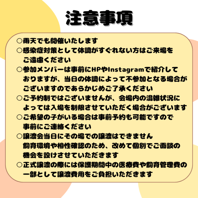 ●譲渡会当日にその場での譲渡はできません