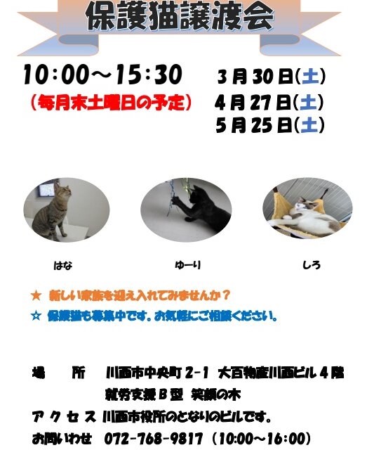 3月30日(土)10:00~15:30に保護猫譲渡会を致します。