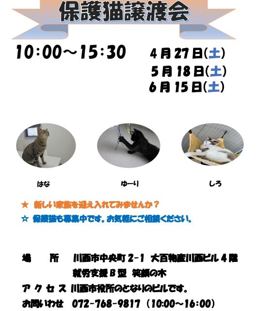 明日、4月27日(土)10:00~15:30保護猫譲渡会を開催致します。
