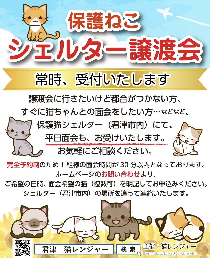 保護 猫ハウスの譲渡会随時受付しています。お気軽にご連絡ください。