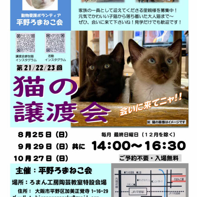 「第23回 平野ろまねこ譲渡会」を開催致します。 かわいい子猫から落ち着いた大人猫までが参加します! ベテランの保護主が、参加猫達のケアや人馴れ修業を施して皆様とのご縁をお待ちしています! ご予約不要・入場無料です。 見学だけでも歓迎致します。 皆様のお越しをお待ちしております! (会場入口で手指の消毒をお願いします。譲渡は各保護主により譲渡譲渡条件が異なります。会場でスタッフにおたずね下さい。) ●JR平野駅北出口下車、東へ徒歩7分 ●お車では近隣のコインパーキングをご利用下さい。