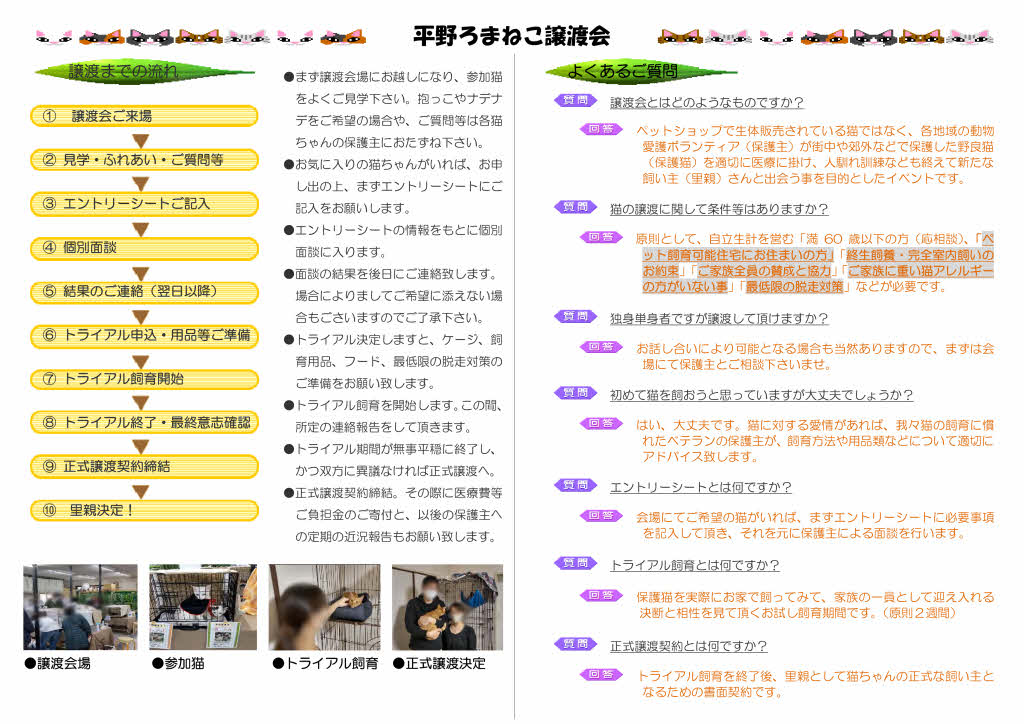 第24回 平野ろまねこ譲渡会 募集番号:56543 掲載日:2024/10/28 開催日 2024/11/24 時間 14:00~16:30 場所 大阪市平野区加美正覚寺1-16-29 会場名 ろまん工房陶芸教室 特設会場 内容 「第24回 平野ろまねこ譲渡会」を開催致します。 かわいい子猫から落ち着いた大人猫までが参加します! ベテランの保護主が、参加猫達のケアや人馴れ修業を施して皆様とのご縁をお待ちしています! ご予約不要・入場無料です。 見学だけでも歓迎致します。 皆様のお越しをお待ちしております! (会場入口で手指の消毒をお願いします。譲渡は各保護主により譲渡譲渡条件が異なります。会場でスタッフにおたずね下さい。) ●JR平野駅北出口下車、東へ徒歩7分 ●お車では近隣のコインパーキングをご利用下さい。 ●活動インスタグラム https://www.instagram.com/romanekokai/ ●譲渡会参加猫インスタグラム https://www.instagram.com/romaneko_jyotokai/ ●メール hiranoromaneko@gmail.com 開催日: 2024/11/24 時間: 14:00~16:30 場所: 大阪市平野区加美正覚寺1-16-29 会場名: ろまん工房陶芸教室 特設会場 画像2枚目: 画像3枚目: 画像4枚目: スポンサーリンク この譲渡会情報をSNSで広めよう! Twitterでシェア Facebookでシェア はてなブックマーク LINEで教える 投稿者: Warning: Undefined variable $userID in /home/petwa/pochi-tama.net/public_html/wp-content/themes/pet/single-joutokai.php on line 150 平野ろまねこ会 この投稿者の情報を見る