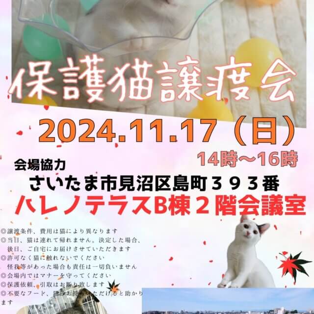 【さいたま市見沼区】11/17(日)ハレノテラス保護猫譲渡会