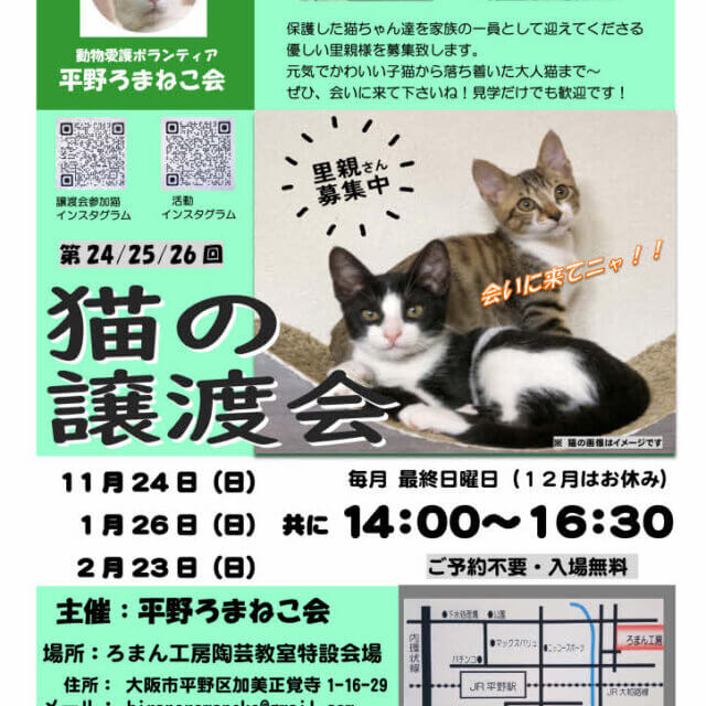 第26回平野ろまねこ譲渡会 募集番号:59654 掲載日:2025/02/01 開催日 2024/2/23 時間 14:00~16:30 場所 大阪市平野区加美正覚寺1-16-29 会場名 ろまん工房陶芸教室 特設会場 内容 「第26回 平野ろまねこ譲渡会」を開催致します。 かわいい子猫から落ち着いた大人猫までが参加します! ベテランの保護主が、参加猫達のケアや人馴れ修業を施して皆様とのご縁をお待ちしています! ご予約不要・入場無料です。 見学だけでも歓迎致します。 皆様のお越しをお待ちしております! (会場入口で手指の消毒をお願いします。譲渡は各保護主により譲渡譲渡条件が異なります。会場でスタッフにおたずね下さい。) ●JR平野駅北出口下車、東へ徒歩7分 ●お車では近隣のコインパーキングをご利用下さい。 ●活動インスタグラム https://www.instagram.com/romanekokai/ ●譲渡会参加猫インスタグラム https://www.instagram.com/romaneko_jyotokai/ ●メール hiranoromaneko@gmail.com 開催日: 2024/2/23 時間: 14:00~16:30 場所: 大阪市平野区加美正覚寺1-16-29 会場名: ろまん工房陶芸教室 特設会場 画像2枚目: 画像3枚目: 画像4枚目: スポンサーリンク この譲渡会情報をSNSで広めよう! Twitterでシェア Facebookでシェア はてなブックマーク LINEで教える 投稿者: Warning: Undefined variable $userID in /home/petwa/pochi-tama.net/public_html/wp-content/themes/pet/single-joutokai.php on line 150 平野ろまねこ会 この投稿者の情報を見る