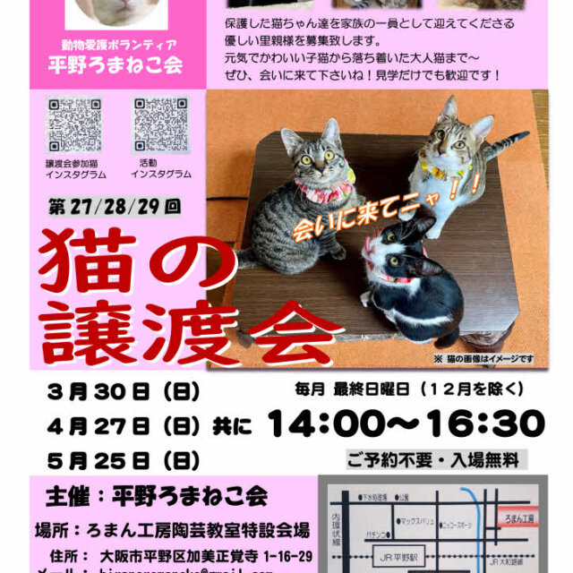 「第28回 平野ろまねこ譲渡会」を開催致します。 かわいい子猫から落ち着いた大人猫までが参加します! ベテランの保護主が、参加猫達のケアや人馴れ修業を施して皆様とのご縁をお待ちしています! ご予約不要・入場無料です。 見学だけでも歓迎致します。 皆様のお越しをお待ちしております! (会場入口で手指の消毒をお願いします。譲渡は各保護主により譲渡譲渡条件が異なります。会場でスタッフにおたずね下さい。) ●JR平野駅北出口下車、東へ徒歩7分 ●お車では近隣のコインパーキングをご利用下さい。