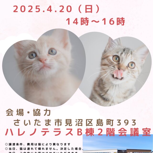 【さいたま市】4/20(日)ハレノテラス保護猫譲渡会