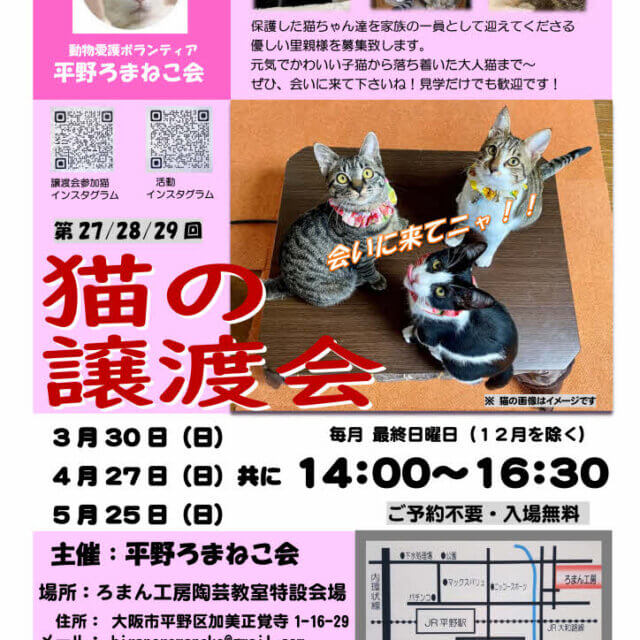 「第29回 平野ろまねこ譲渡会」を開催致します。 かわいい子猫から落ち着いた大人猫までが参加します! ベテランの保護主が、参加猫達のケアや人馴れ修業を施して皆様とのご縁をお待ちしています! 見学だけでも歓迎致します。 皆様のお越しをお待ちしております! (会場入口で手指の消毒をお願いします。譲渡は各保護主により譲渡譲渡条件が異なります。会場でスタッフにおたずね下さい。)
