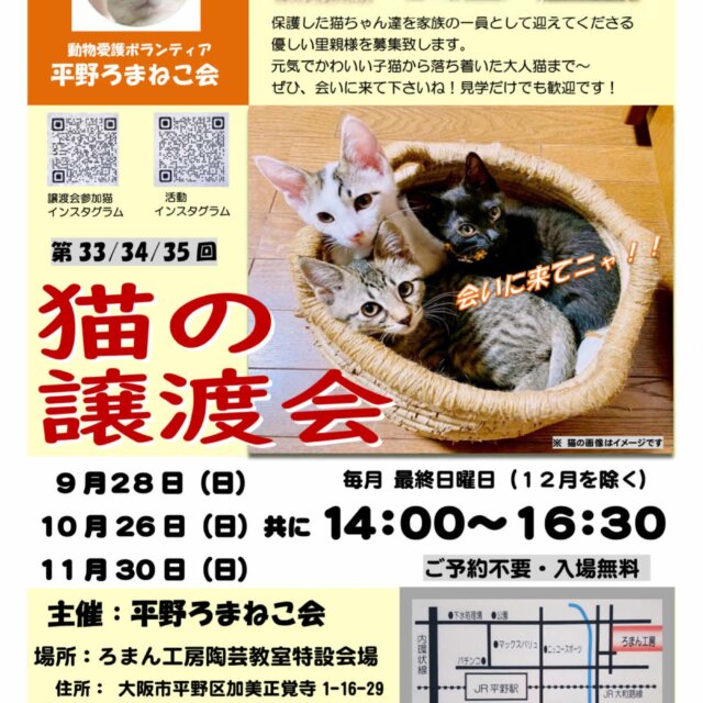 「第35回 平野ろまねこ譲渡会」を開催致します。 本年度最後の譲渡会となります。かわいい子猫から落ち着いた大人猫までが参加します! ベテランの保護主が、参加猫達のケアや人馴れ修業を施して皆様とのご縁をお待ちしています。見学だけでも歓迎!皆様のお越しをお待ちしております! (会場入口で手指の消毒をお願いします。譲渡は各保護主により譲渡譲渡条件が異なります。会場でスタッフにおたずね下さい。)