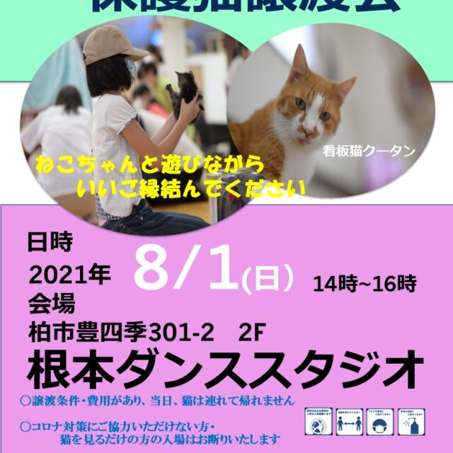 8/1 柏市根本ダンススタジオ猫カフェ風保護猫譲渡会