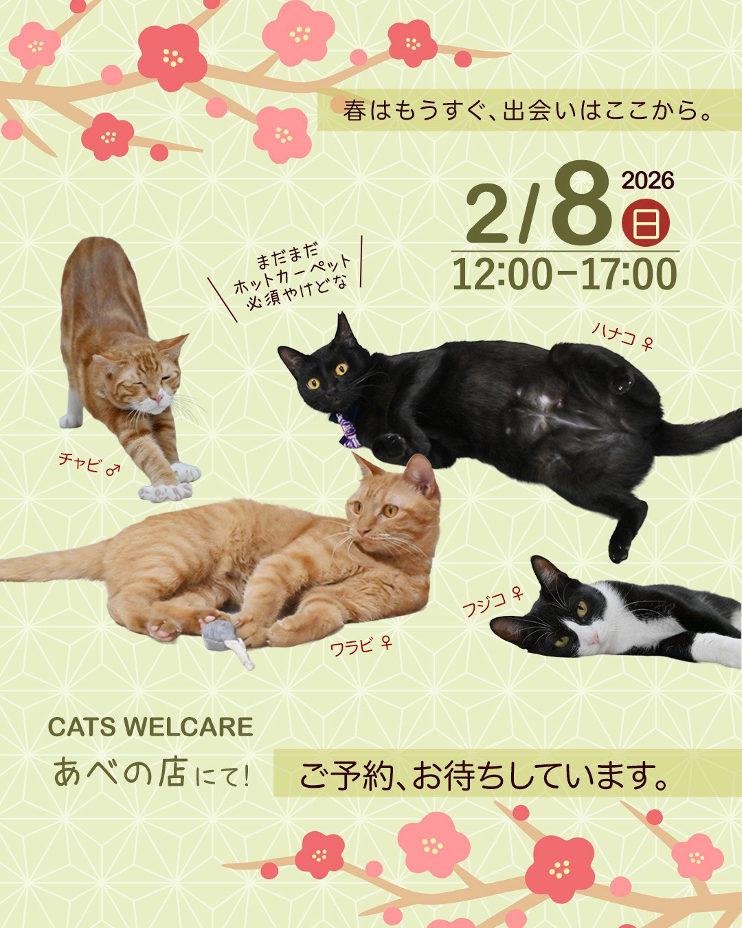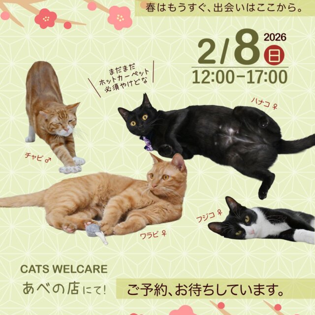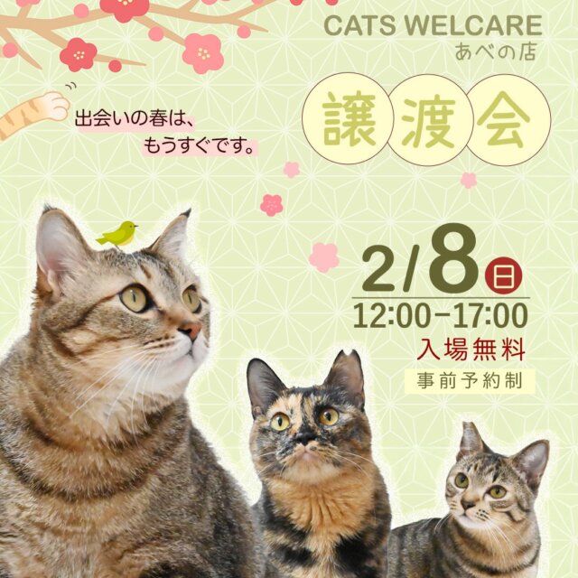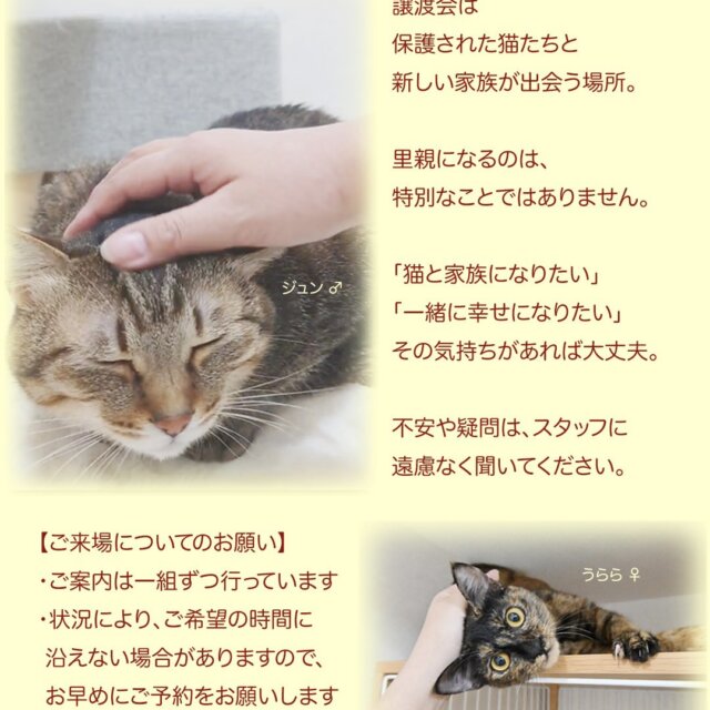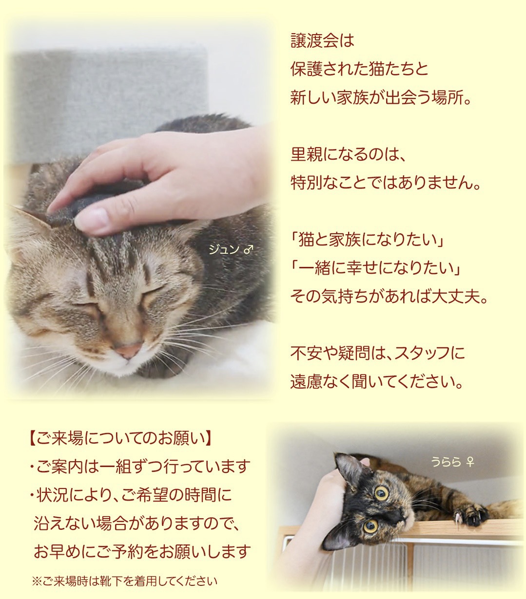 毎月第1日曜の11時~13時と14時~16時の2部制にて【保護ねこの家 譲渡会】を開催しています。