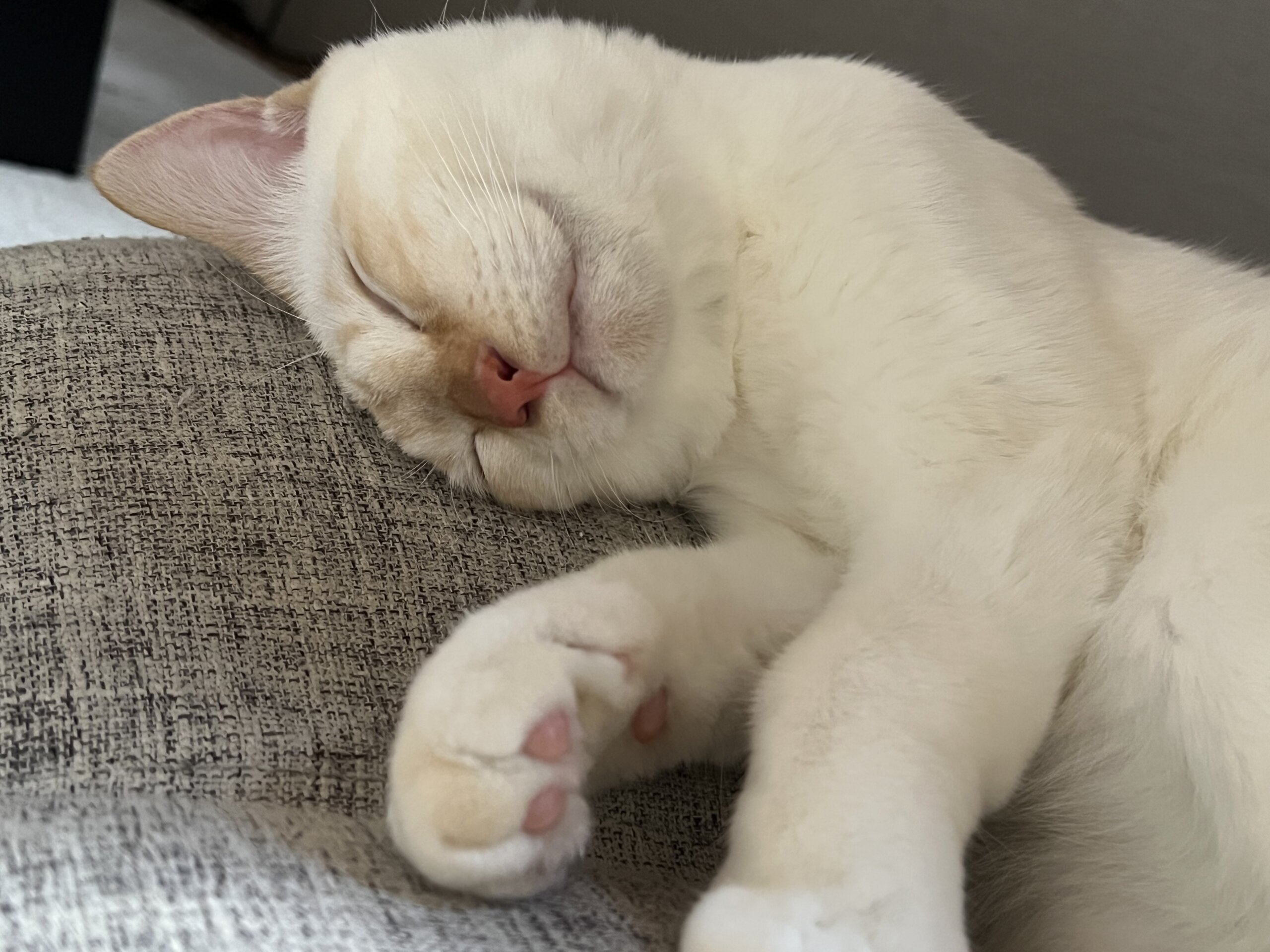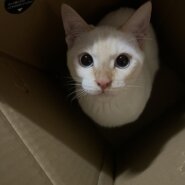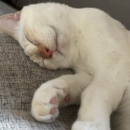 人懐っこく人と一緒に寝ることが大好きな白猫です。