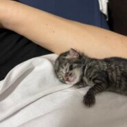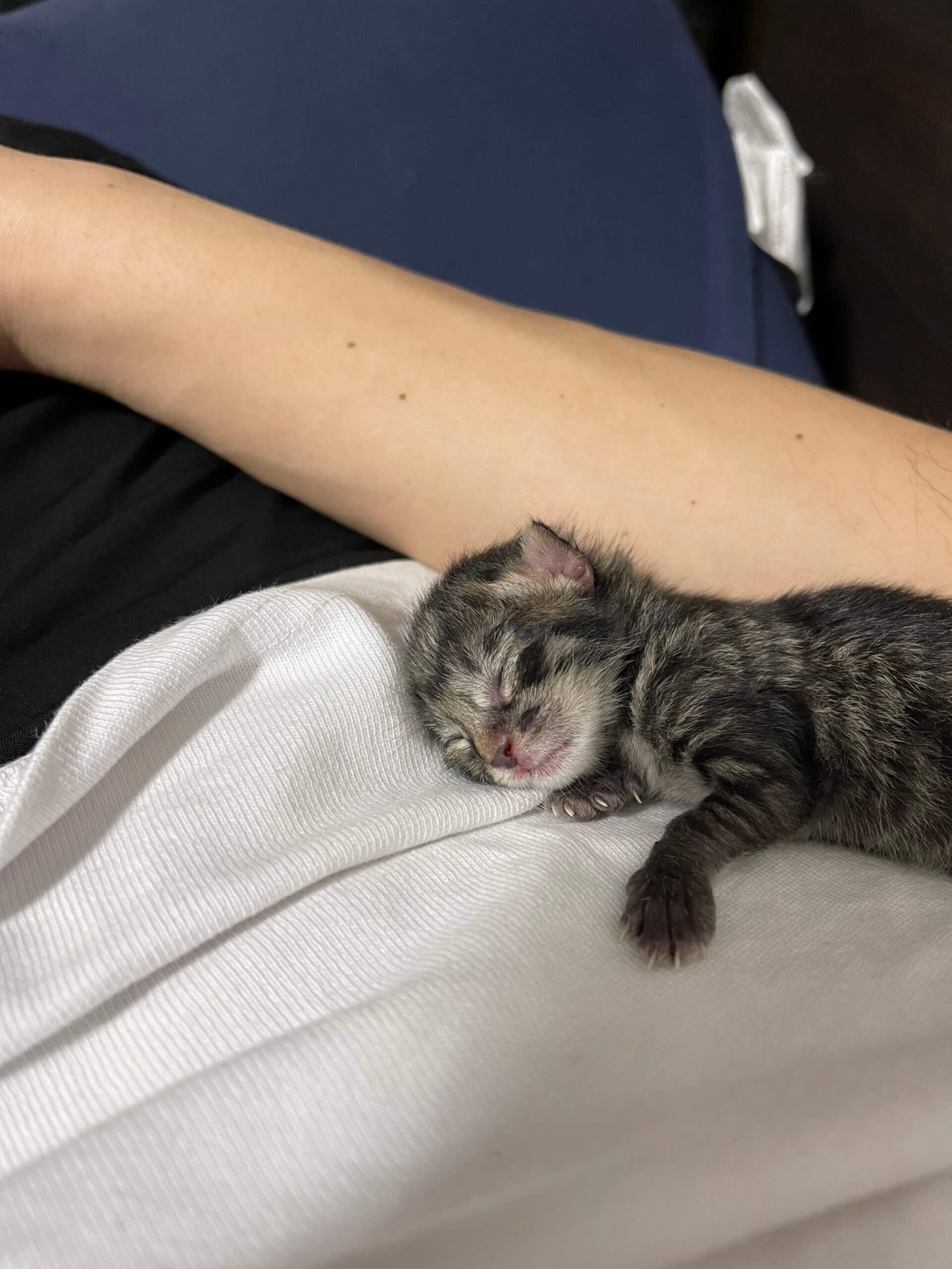 臍の緒がついたままの子猫が道路の隅で震えていたのですぐ動物病院に連れて行き飼うことを決めましたが仕事で4時間ごとにミルクを与えてあげられないので、ミルク期間が終わるまで面倒を見ていただける方を募集しています。